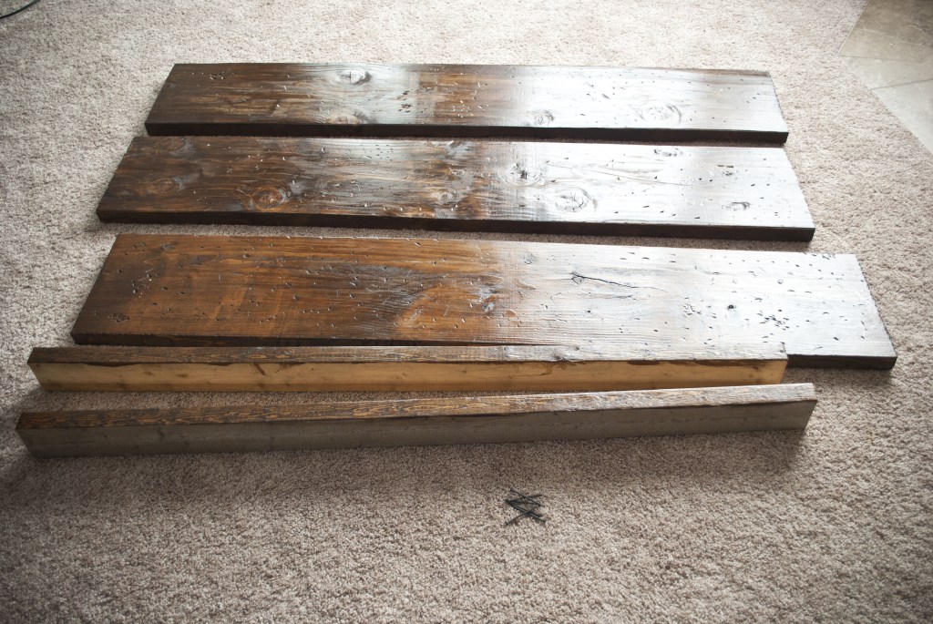 I weathered them (pretty much beat them with a hammer), sanded them, stained them (English Chestnut), added 2 coats of poly, and let them dry/air out for about 24 hours. I only stained one side of the boards (the side that would be seen from the outside).