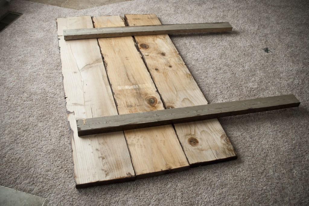 I flipped all of the boards over and squished them tight together. Then I laid out the supports. Make sure to do this step close to where you will be setting up the headboard because it is kinda heavy!