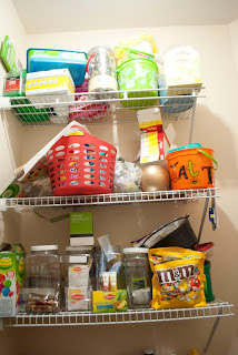 In my recent kitchen post, I showed you all how we have a snack stash in our kitchen. Well, we also have a snack basket in the pantry. Basically, anything snackish that is individual wrapped goes in here. This way I can trash a few boxes right away. It's nice to just check the basket when we need a little something yummy... or a quick snack to go.