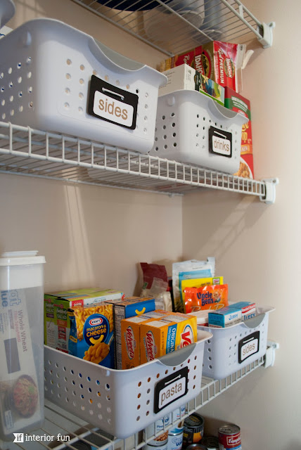 I hopped online and bought 6 new baskets from Amazon (I measured the shelves first to get an idea of the size I wanted). Baskets are SO helpful just in general. In this case, they work to group food items together. We have categories like sides, drinks, pasta, baking and snacks. Now I can easily pull a basket off of the shelf to get what I need rather than searching and searching. Now the shelves are tidy!