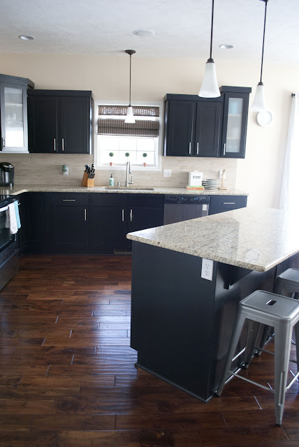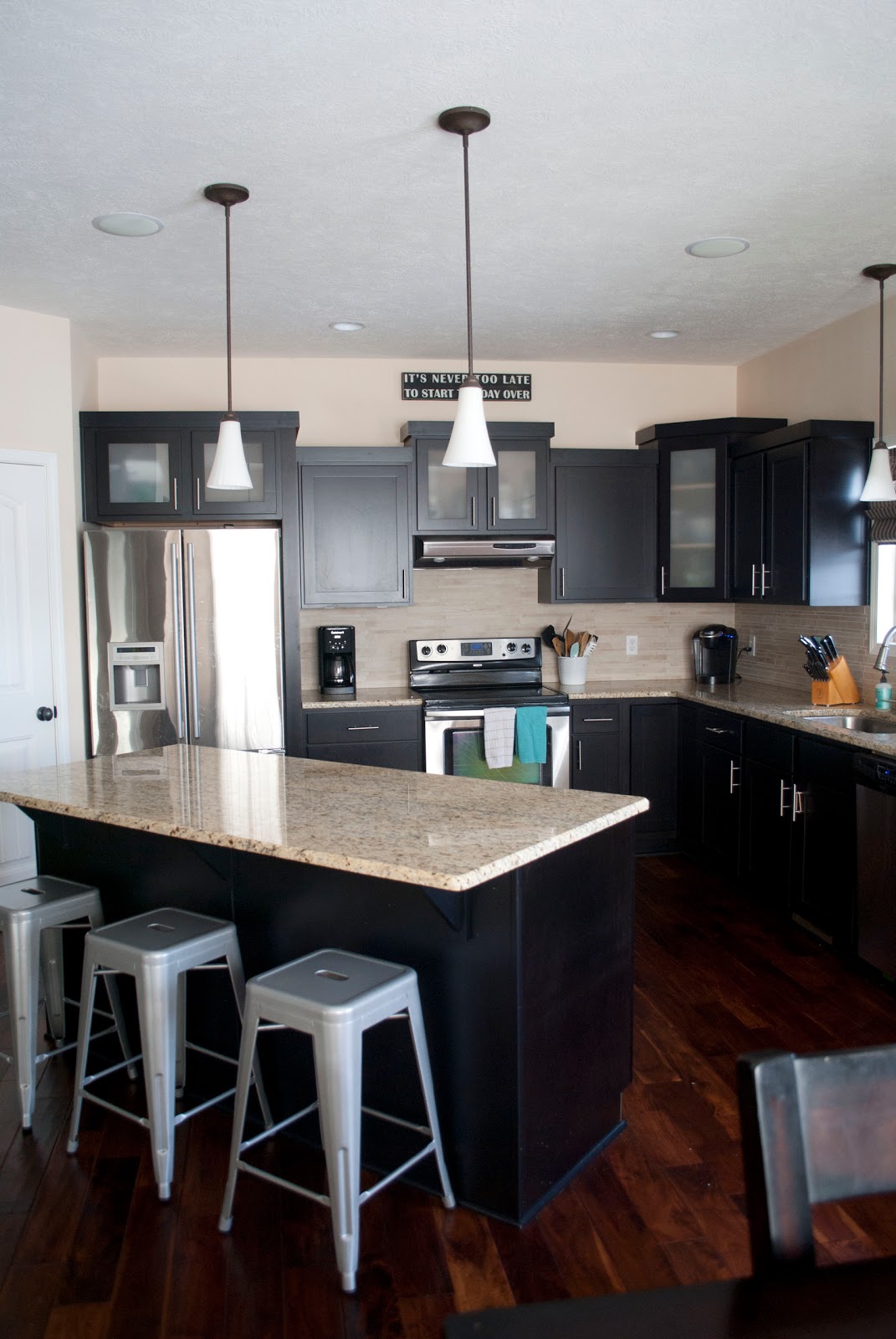 We have super dark cabinets. And while they look black, they are actually a deep deep brown. Pretty much black though. Our hardwoods are also on the darker side. I'm smitten over the way the cabinets and the floors contrast, so I was on the hunt for some stools that would contrast with both. This really limited my options.