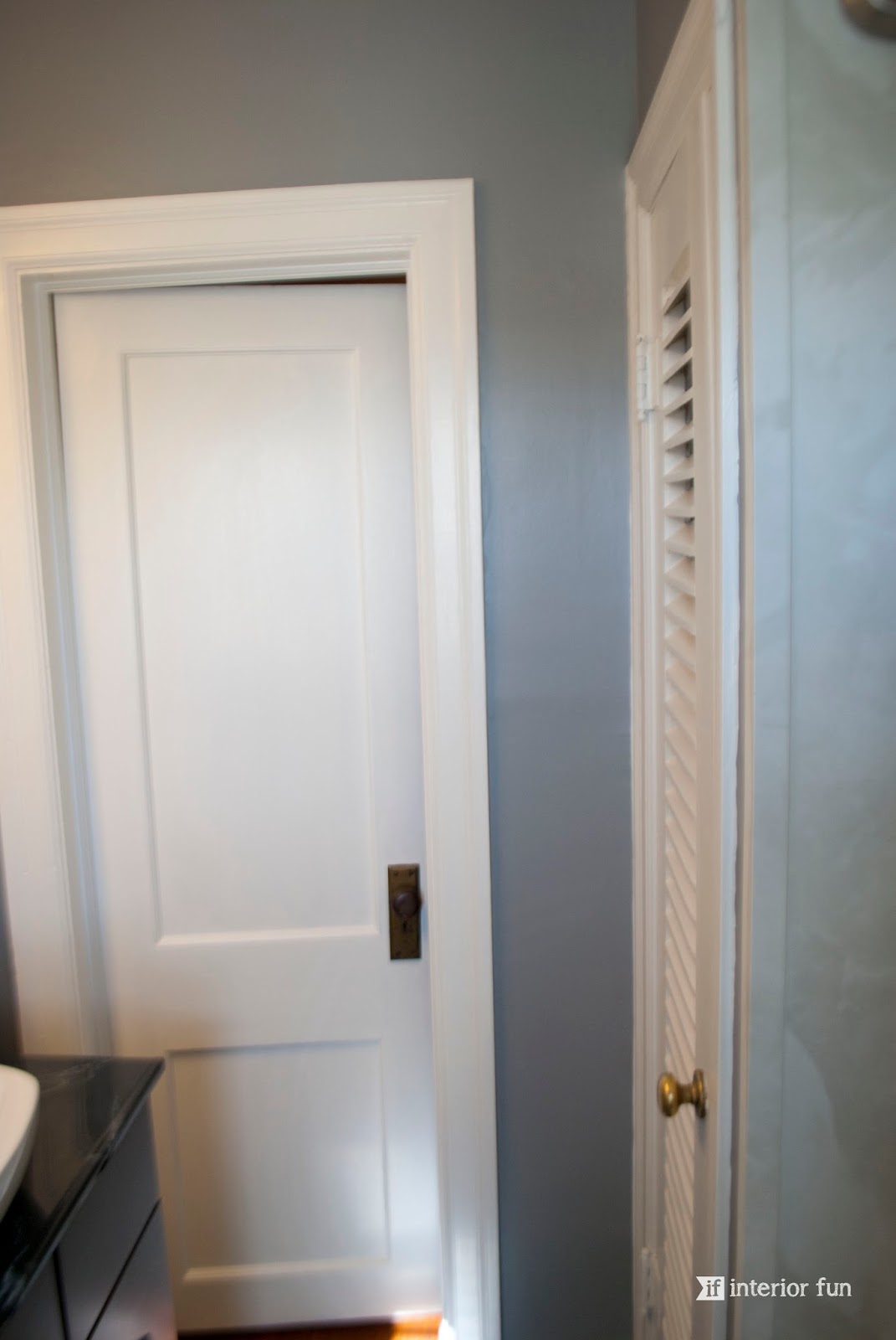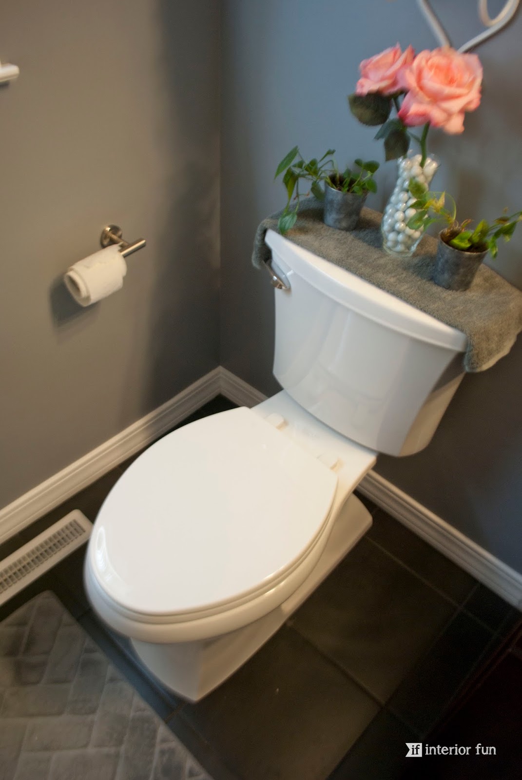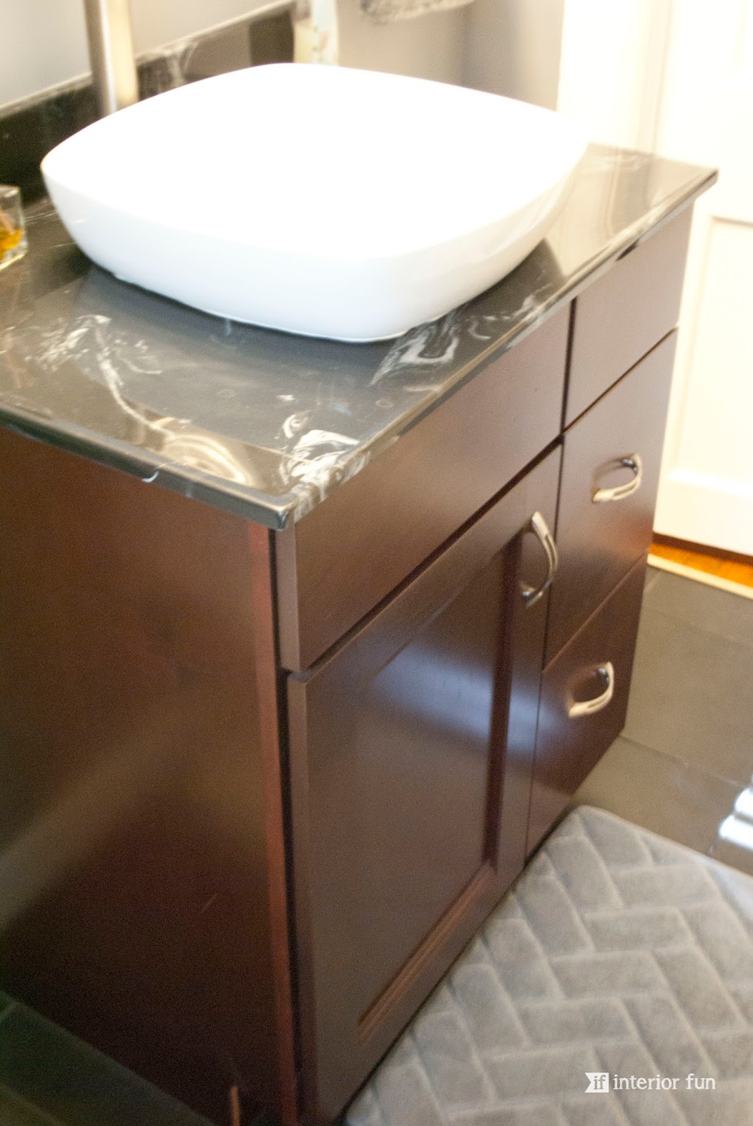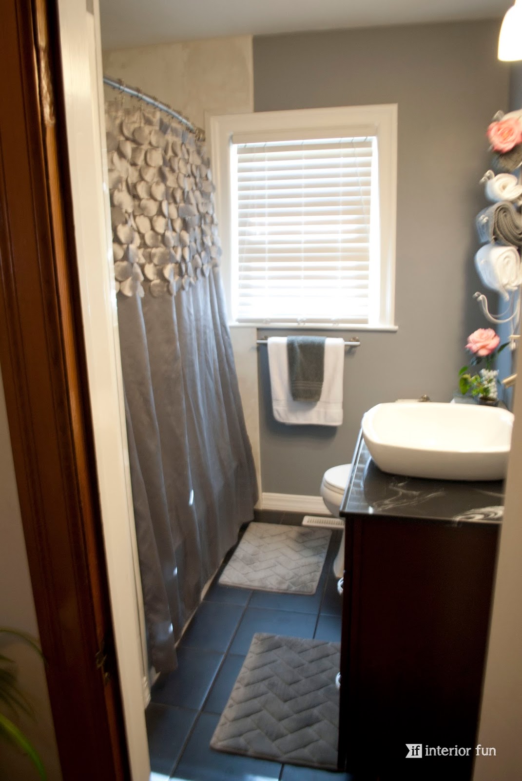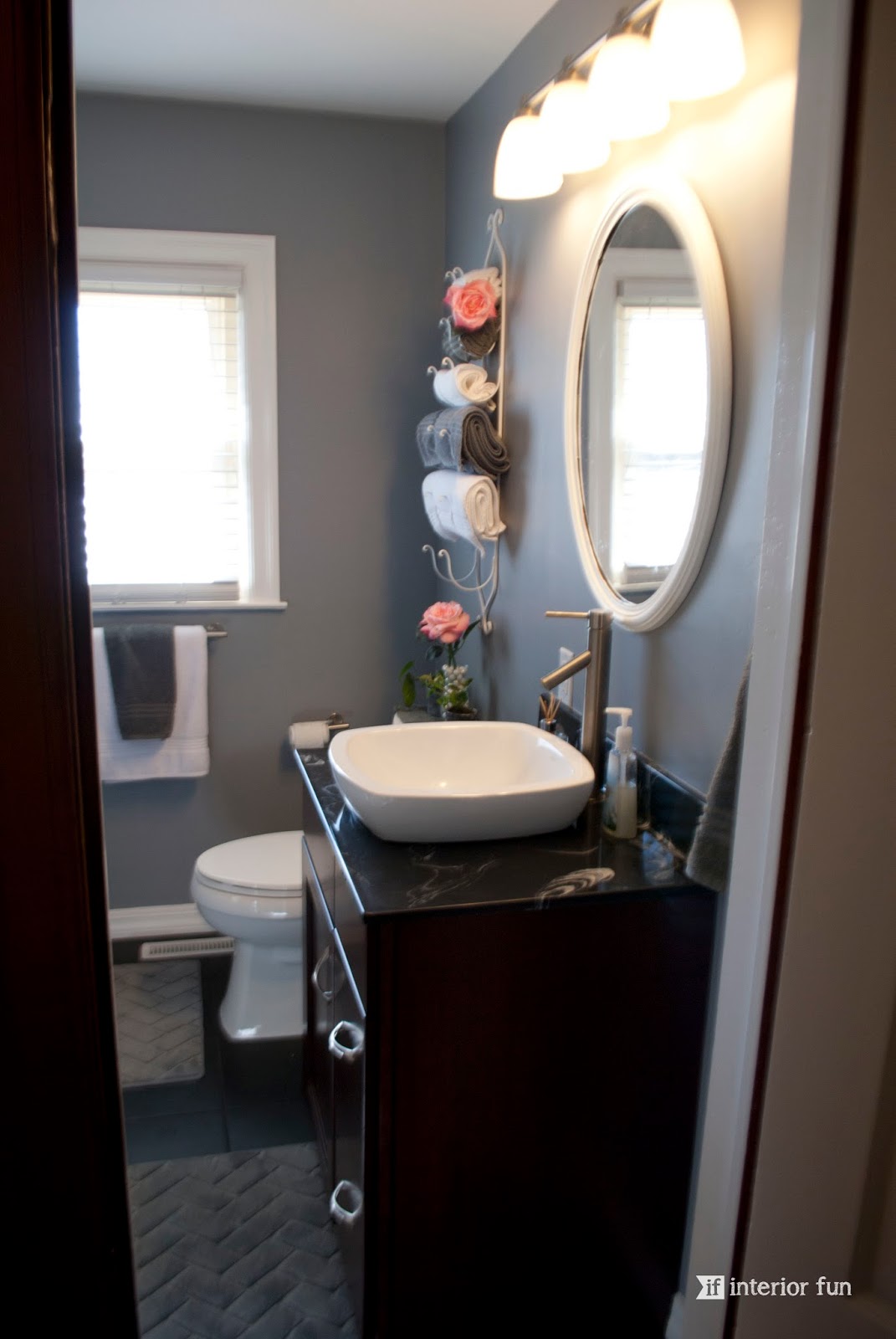 I'm pretty obsessed with the currently popular choice of gray as a neutral. My sister actually picked out the wall color and did a fabulous job. The updated white paint for the trim and doors does wonders for space too -- makes it feel clean and crisp! This bathroom is neutral, but at the same time has great contrast between the cherry wood tone vanity, the black tile flooring, the countertop, the sink, the towel hanger -- it's all so fantastic!