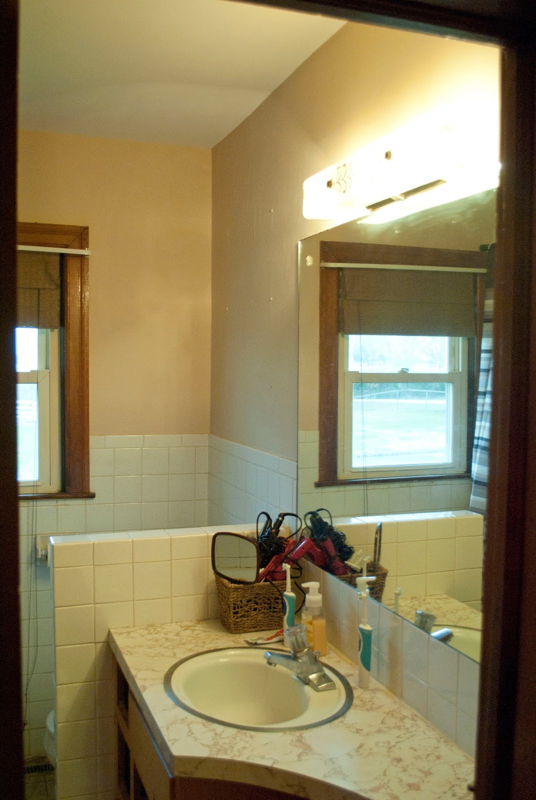 Ready to see a MAJOR transformation? My Mom just had her bathroom completely redone, by professionals, and it looks stunning! She lives in an older home. A much, much older home that had lots of outdated, worn out features. After about a year or so of updating the space has really come along. That's a whole other post for a different day. Back to the bathroom.