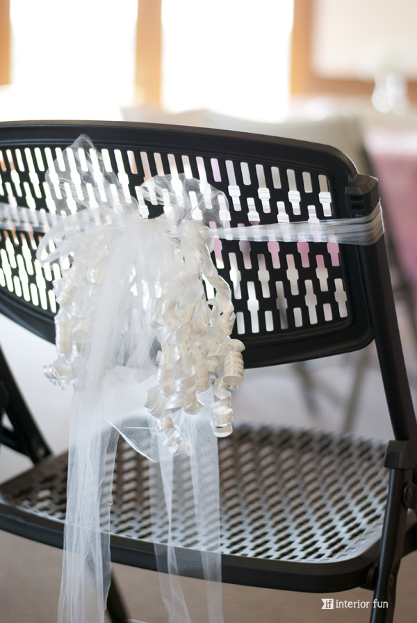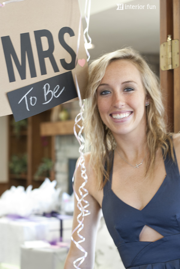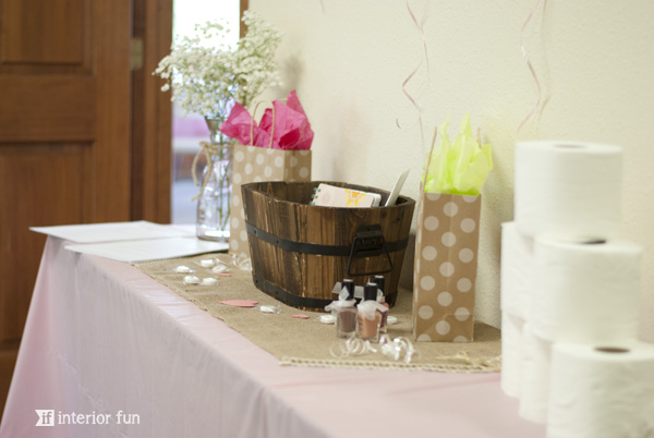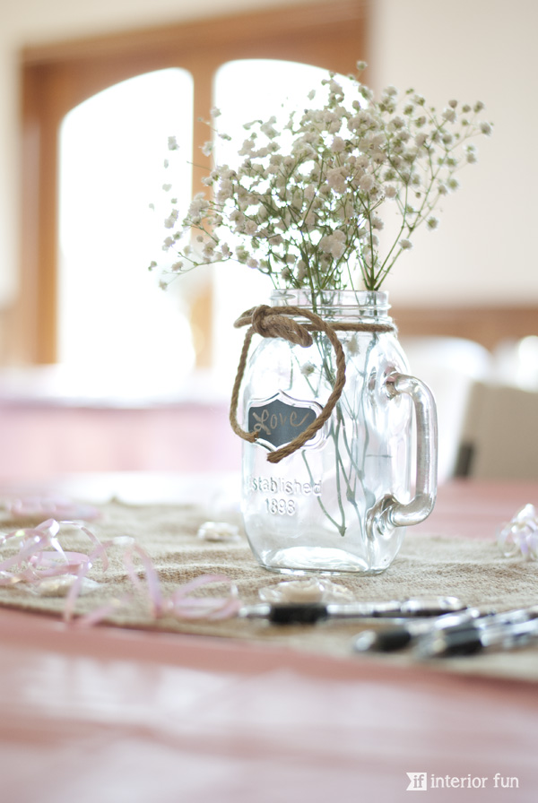 The rest of the decor consisted of colorful table cloths, burlap table runners (reused from a recent wedding), mason jars filled with baby's breath, a special chair for the bride to be, balloons, and pictures.