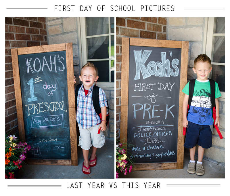 Last year was Koah's first year in "school" so we did a first day picture. We did this again this year and it fun to see the difference. I asked him a few questions about his interests and included those on the chalkboard. Won't that be cute to see how that evolves over the years?