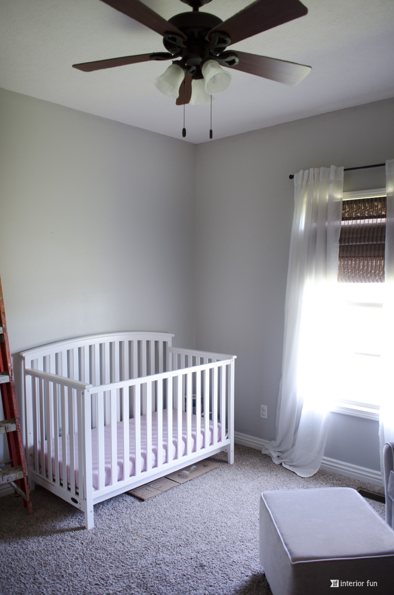 Since this is a child's room I went with an eggshell finish which is wipeable. And because I don't like spending all day painting I color matched the Repose Gray to a Behr primer and paint in one. This meant only one coat, thus only one nap time! I still need to touch up along the ceiling and patch up some previous nail holes, but they haven't bothered me enough to tackle it quite yet.