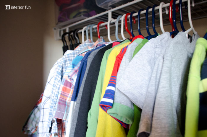 I hang their shirts according to type. Dress shirts & nicer clothing go closest to the wall on collapsable hangers since we don't need to access these as often. They usually only wear these shirts on Sunday for church, or on special occasions. The next closest to the wall are long sleeves, followed by short sleeves. We often will have a few shirts that the boys aren't quite big enough for and bulkier items like sweatshirts that we store on the bottom bar (on the sides of the storage drawers). And that's pretty much it for the hanging clothing!