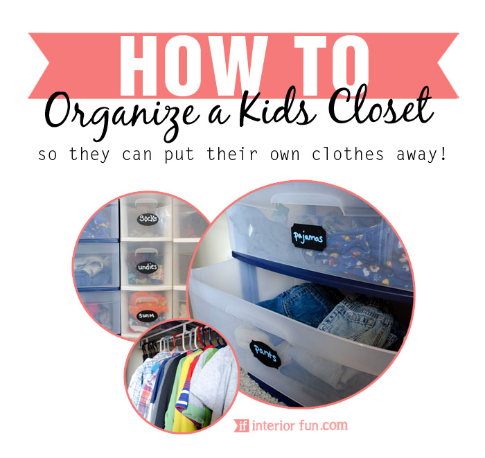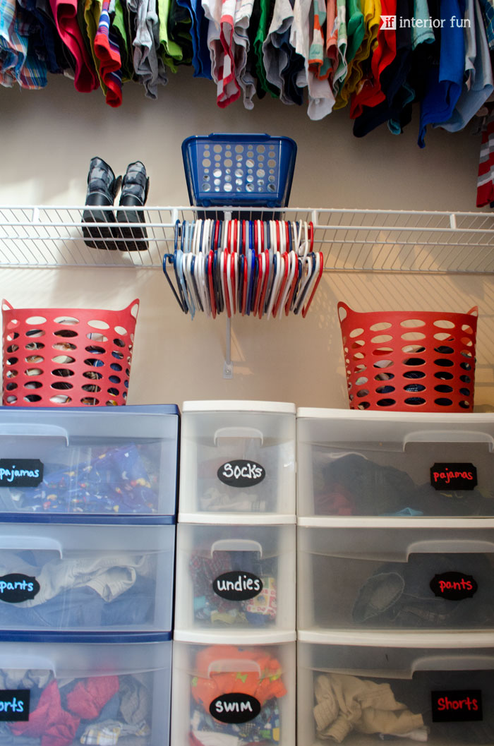 We use a combination of clear storage and labels to create a drawer system for the bottom part of the closet. We also use the closet bar to hang clothes, the shelves for storage and even the back of the door.