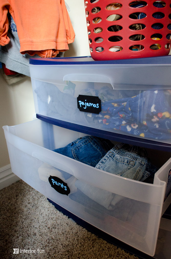 Because the drawer storage is clear the boys can see what is inside before they even open the drawer. Even though this seems to be enough for the boys to figure out where to put their pajamas and socks, I wanted to take the opportunity to assign a label to each drawer. I considered using picture labels, but ultimately decided on text labels. My oldest son is able to read several words already, and this is just another way that I can encourage him to read.