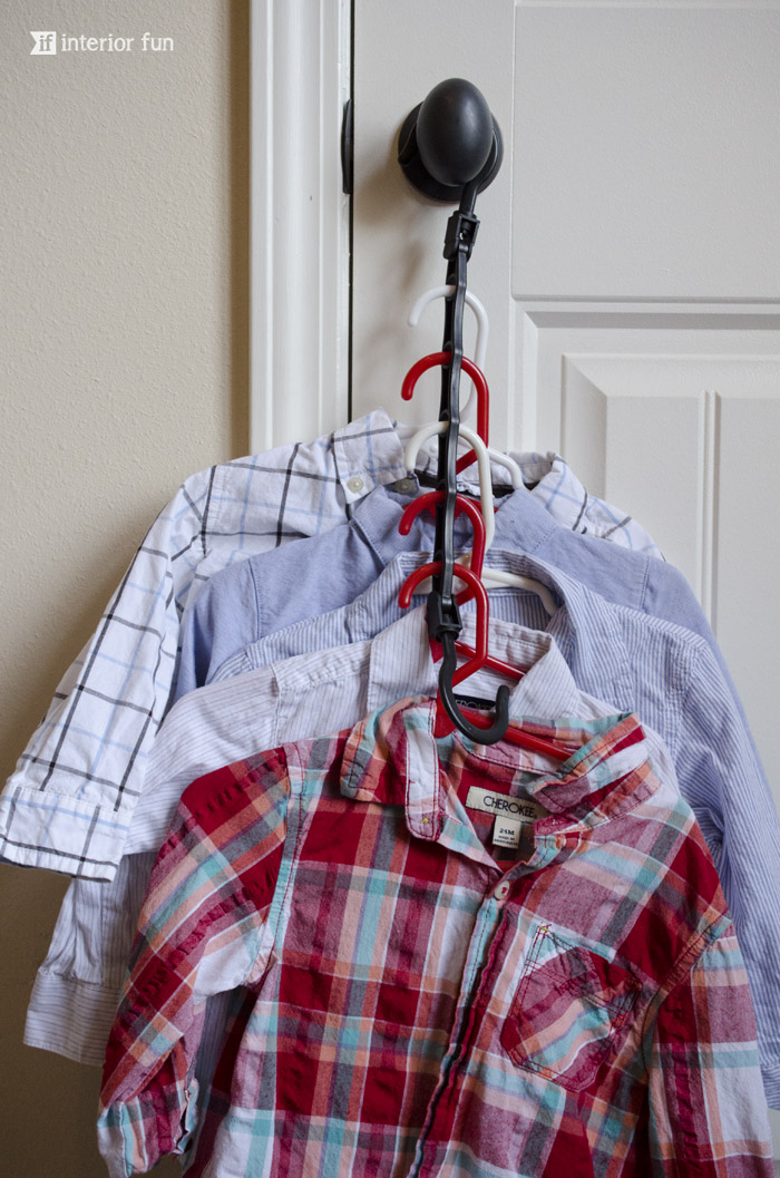 All shirts and jackets are hung up on the top bar. This is one step in the "putting away process" that I am still in charge of. The boys will help me put shirts on hangers occasionally, but it's still a bit challenging for them.