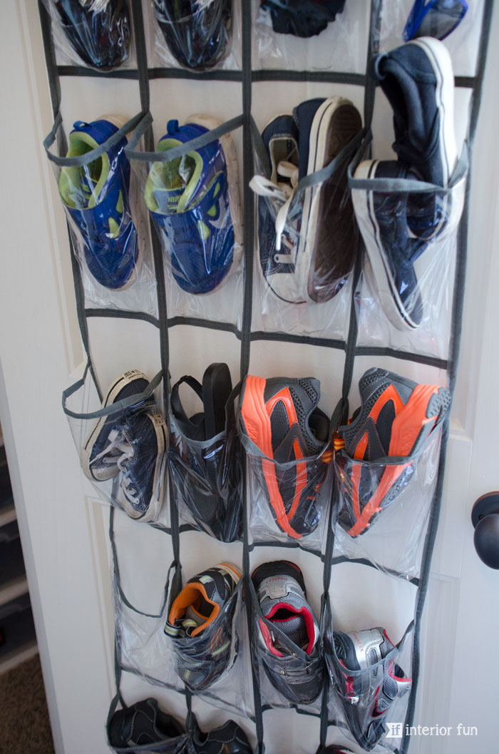 Shoes and belts are placed in pockets that are hanging on the back of the closet door. Any extra sports accessories, like shin guards, are also stored on the shoe organizer. These organizers are amazing, and you can get them for about $5 at Wal-mart.